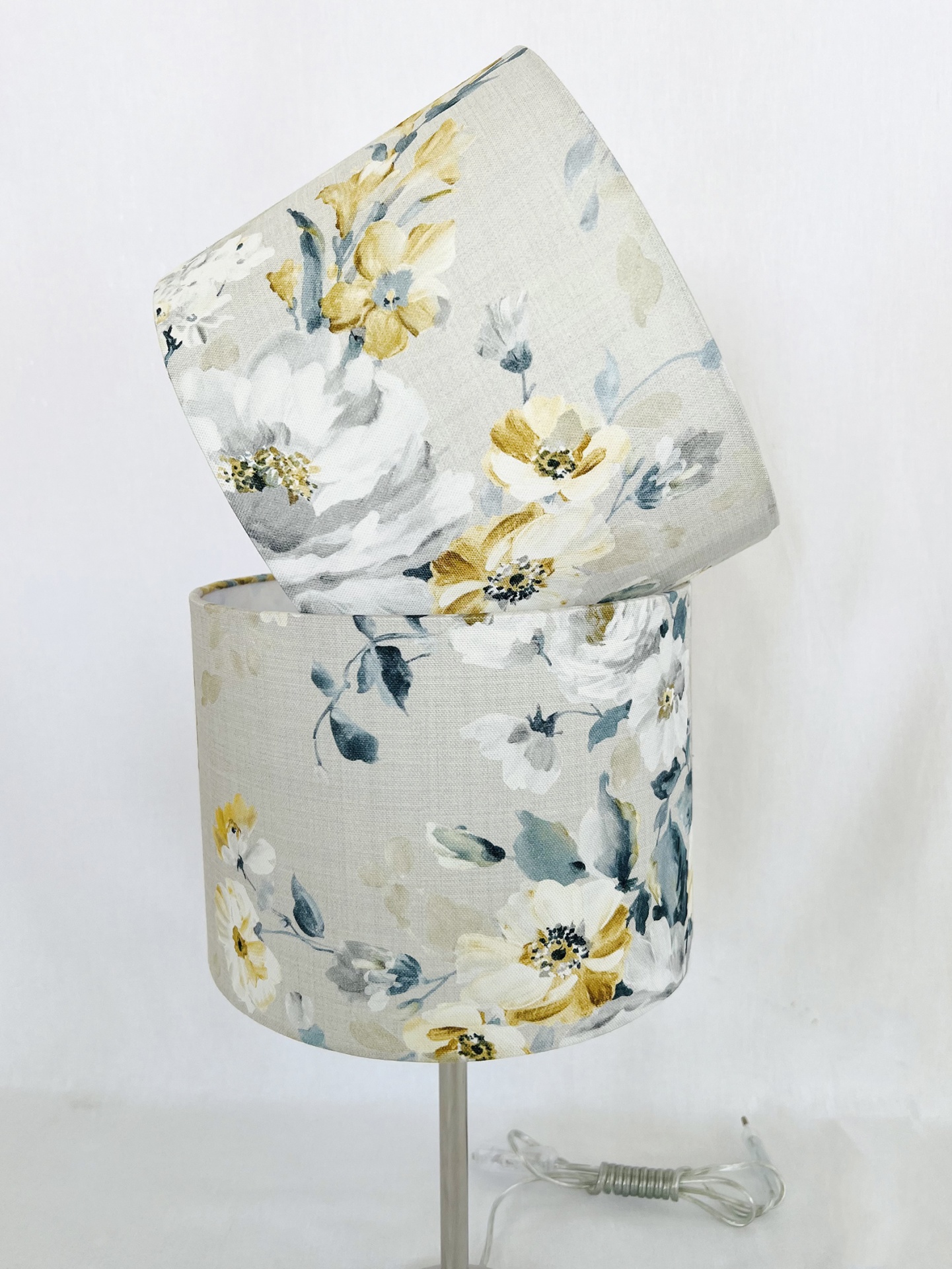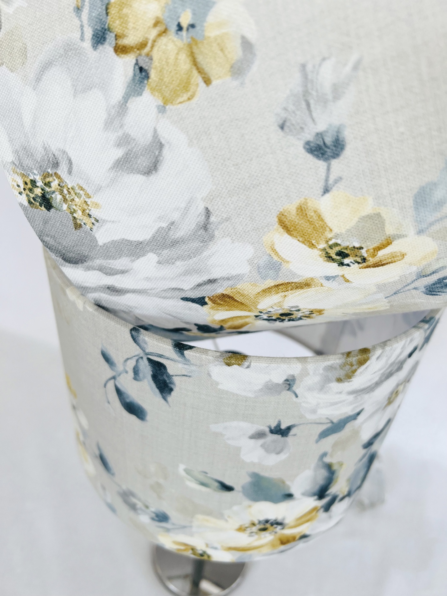 Abat-Jour em tecido com padrão floral com 25cm diâmetro por 18cm altura, fabricado em Portugal.