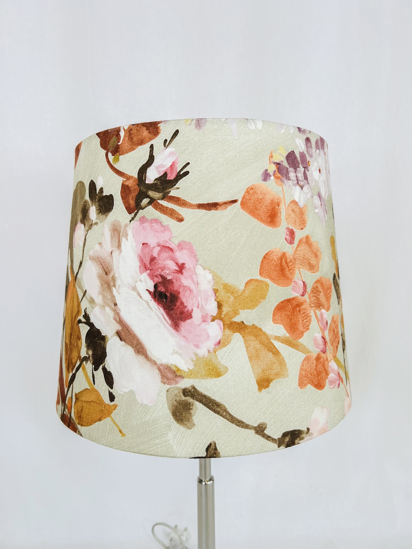 Abat-Jour em tecido com padrão floral com 30cm em baixo 25cm cima e 25cm altura, fabricado em Portugal.