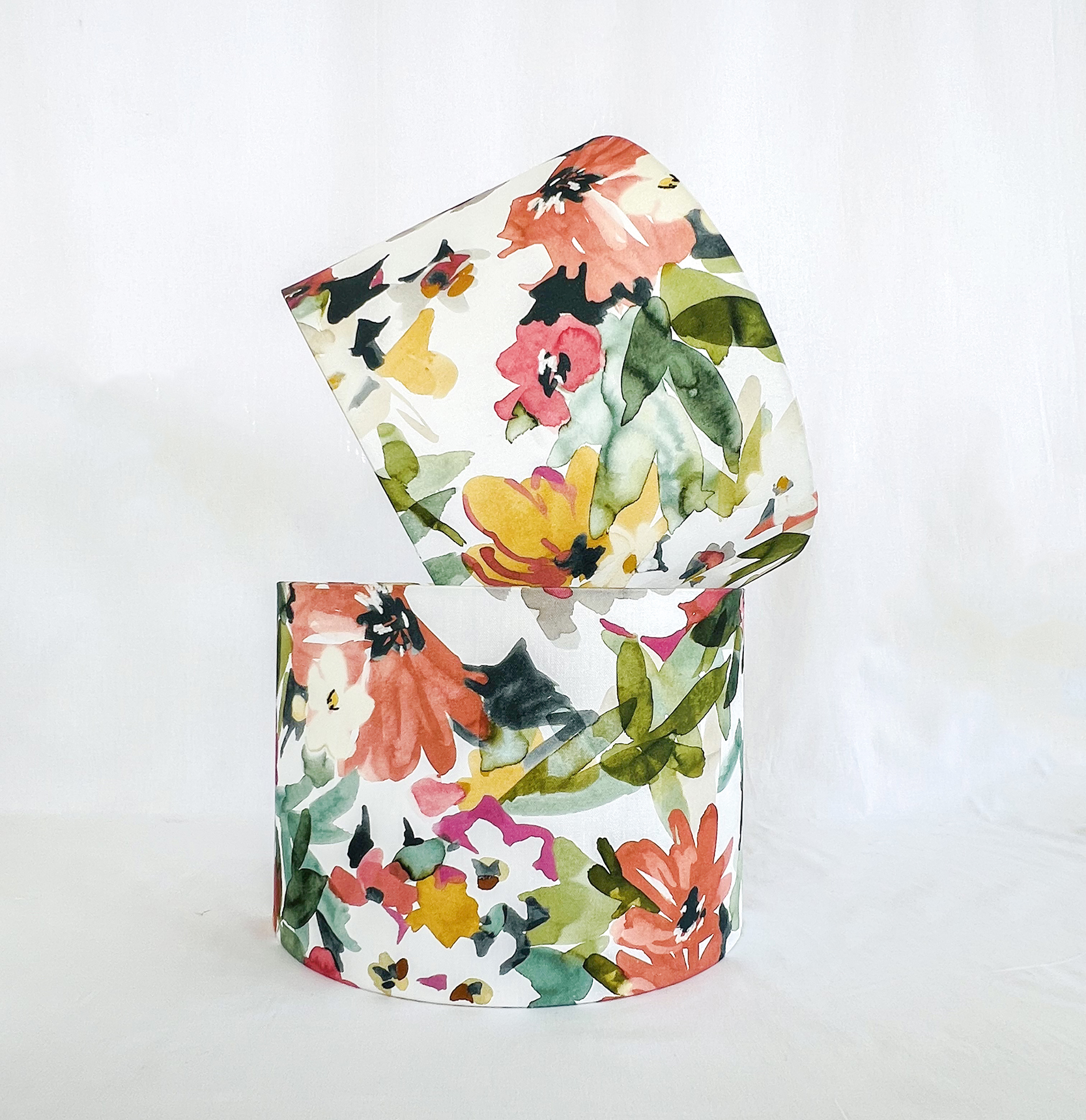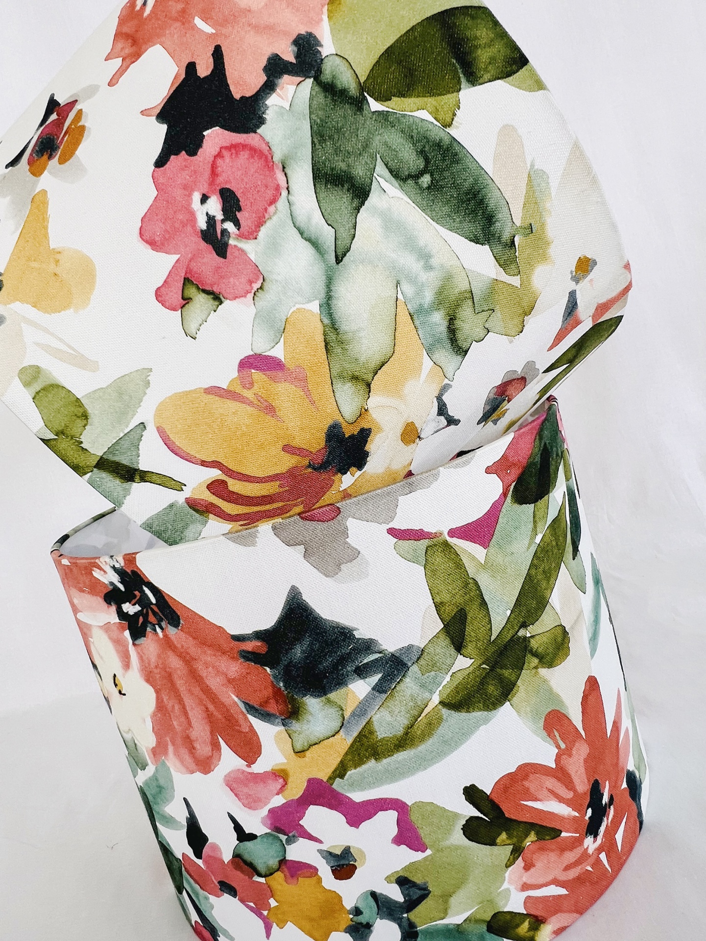 Abat-Jour em tecido com padrão floral com 35cm diâmetro por 25cm altura, fabricado em Portugal.