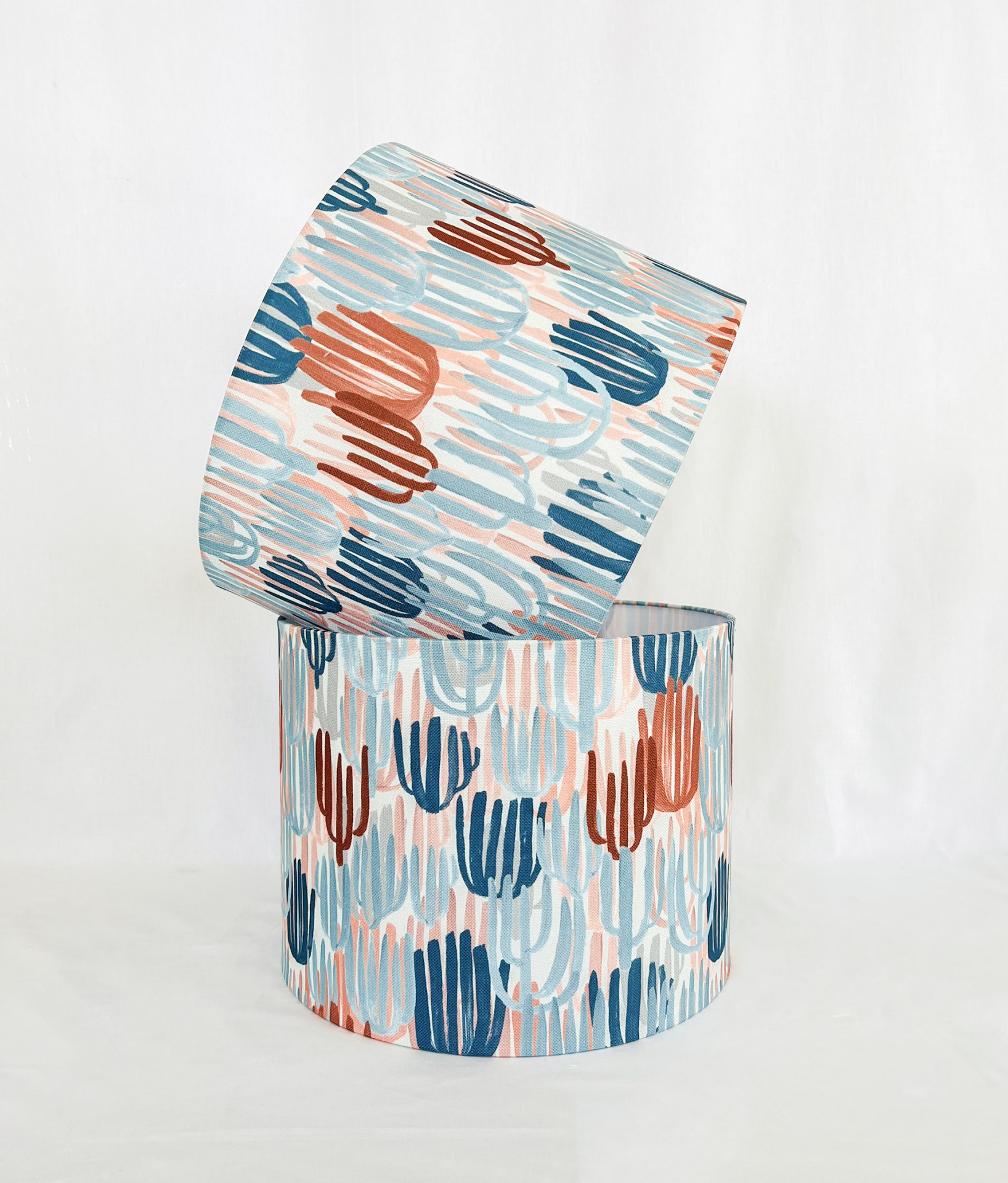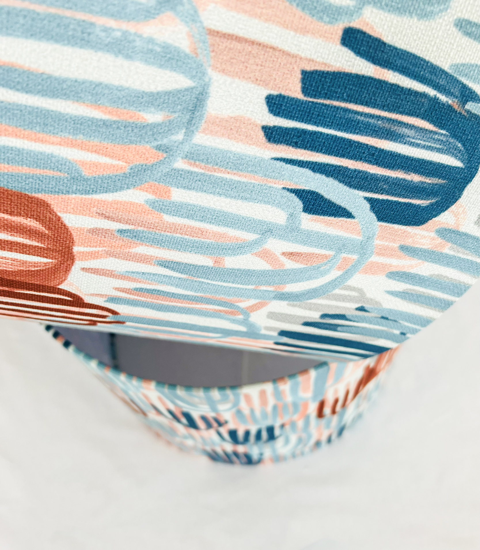 Abat-Jour em tecido com padrão com 40cm diâmetro por 30cm altura, fabricado em Portugal.