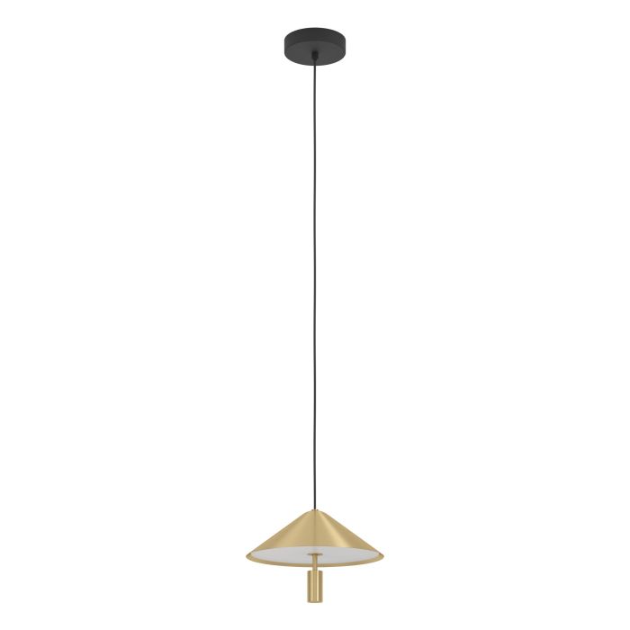O candeeiro suspenso PARAGUAY LED apresenta um novo estilo retro e possui um abajur cónico com acabamento em latão escovado. A superfície tem um belo efeito cintilante. O abajur é suspenso por uma cobertura de aço preto num cabo da mesma cor. Os LEDs integrados produzem uma agradável luz branca quente. O seu design simples e elegante proporciona uma iluminação elegante na sala de estar ou na sala de jantar.