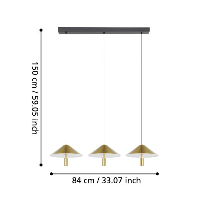 O candeeiro suspenso PARAGUAY LED apresenta um novo design de inspiração retro e inclui três abajures cónicos com acabamento em latão escovado. A superfície tem um belo efeito cintilante. Os abajures são suspensos de uma cobertura alongada em aço preto em cabos da mesma cor. Os LED integrados produzem uma agradável luz branca quente e podem ser regulados através de um regulador rotativo adequado na parede. O seu design simples e elegante proporciona uma iluminação elegante na sala de estar ou na sala de jantar.