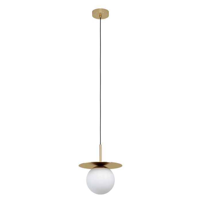 O candeeiro suspenso ARENALES apresenta uma esfera de vidro opalino mate encimada por um disco de metal redondo em latão escovado e suspensa de um dossel da mesma cor. Este candeeiro clássico mistura-se elegantemente com interiores minimalistas, seja na sala de estar ou por cima da mesa na sala de jantar.