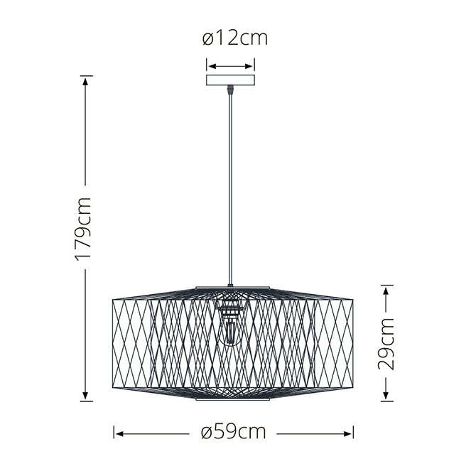 As medidas deste modelo de suspensão são 59 cm de diâmetro e 179 cm de altura máxima, em bamboo e cor preta.
