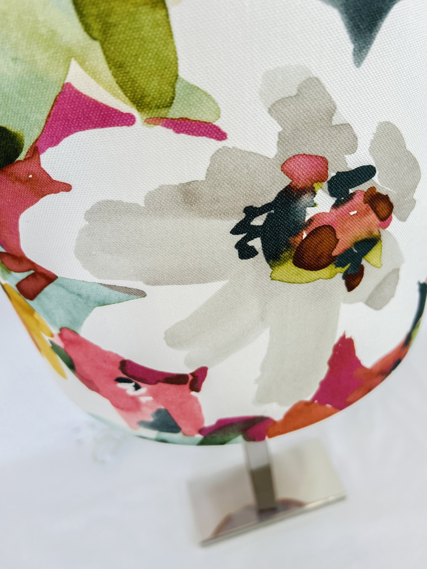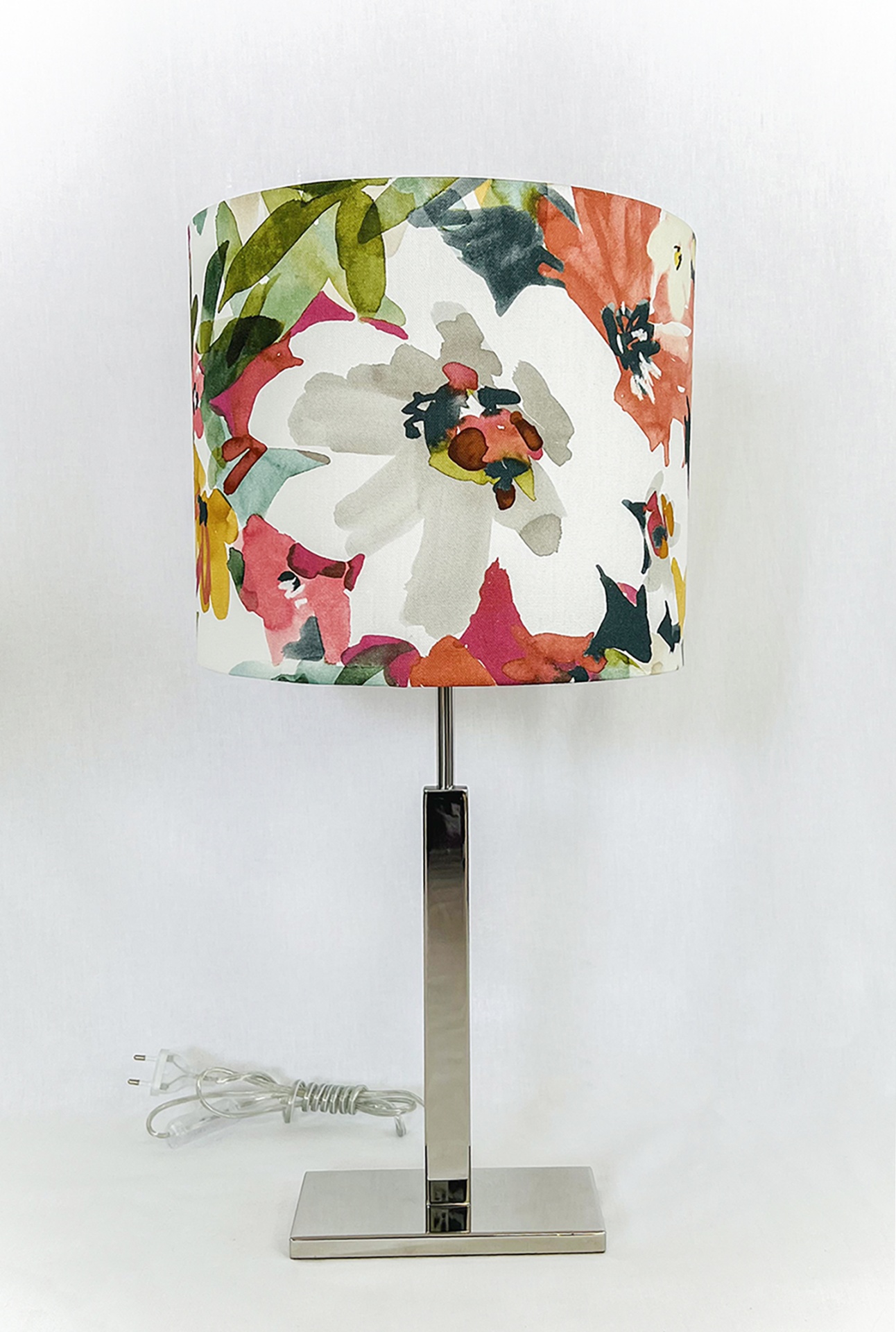 Candeeiro em inox com abat-Jour redondo 30 cm largura e 25cm de altura em tecido, fabricado em Portugal.