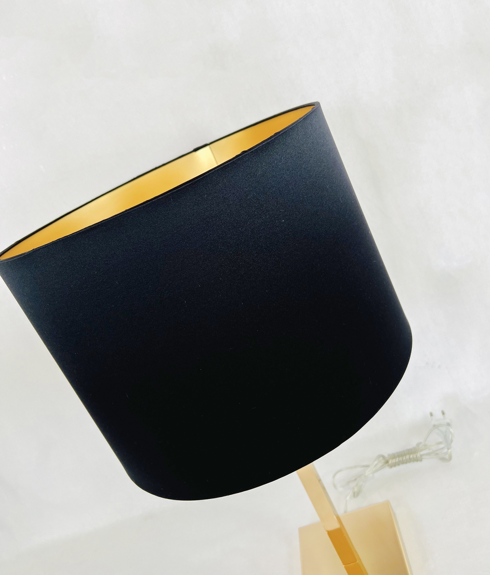 Candeeiro com acabamento dourado polido com abat-Jour redondo 35 cm largura e 25cm de altura em tecido cetim com tela dourada interior, fabricado em Portugal.