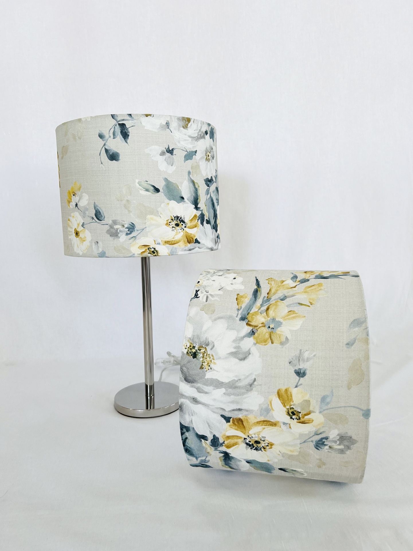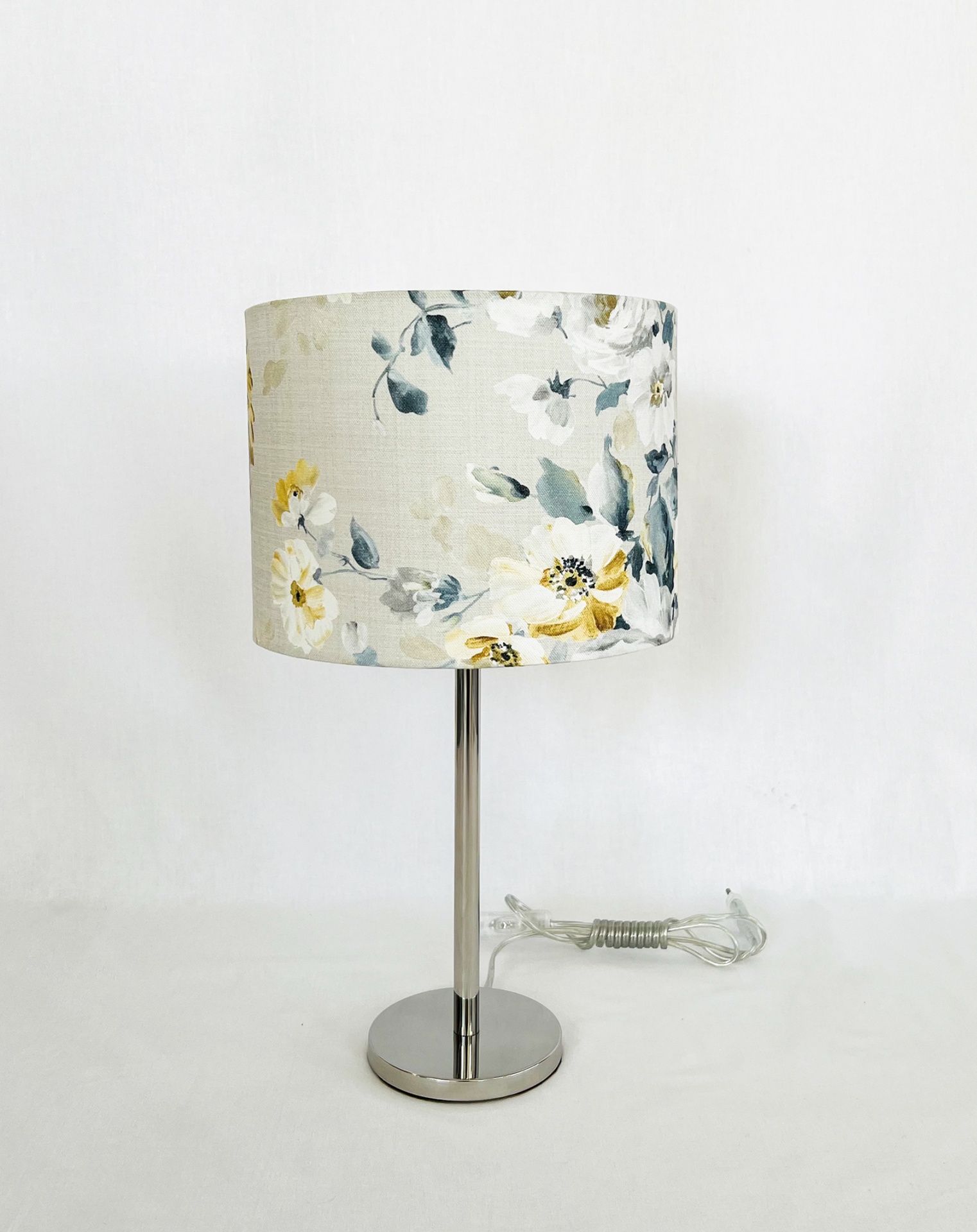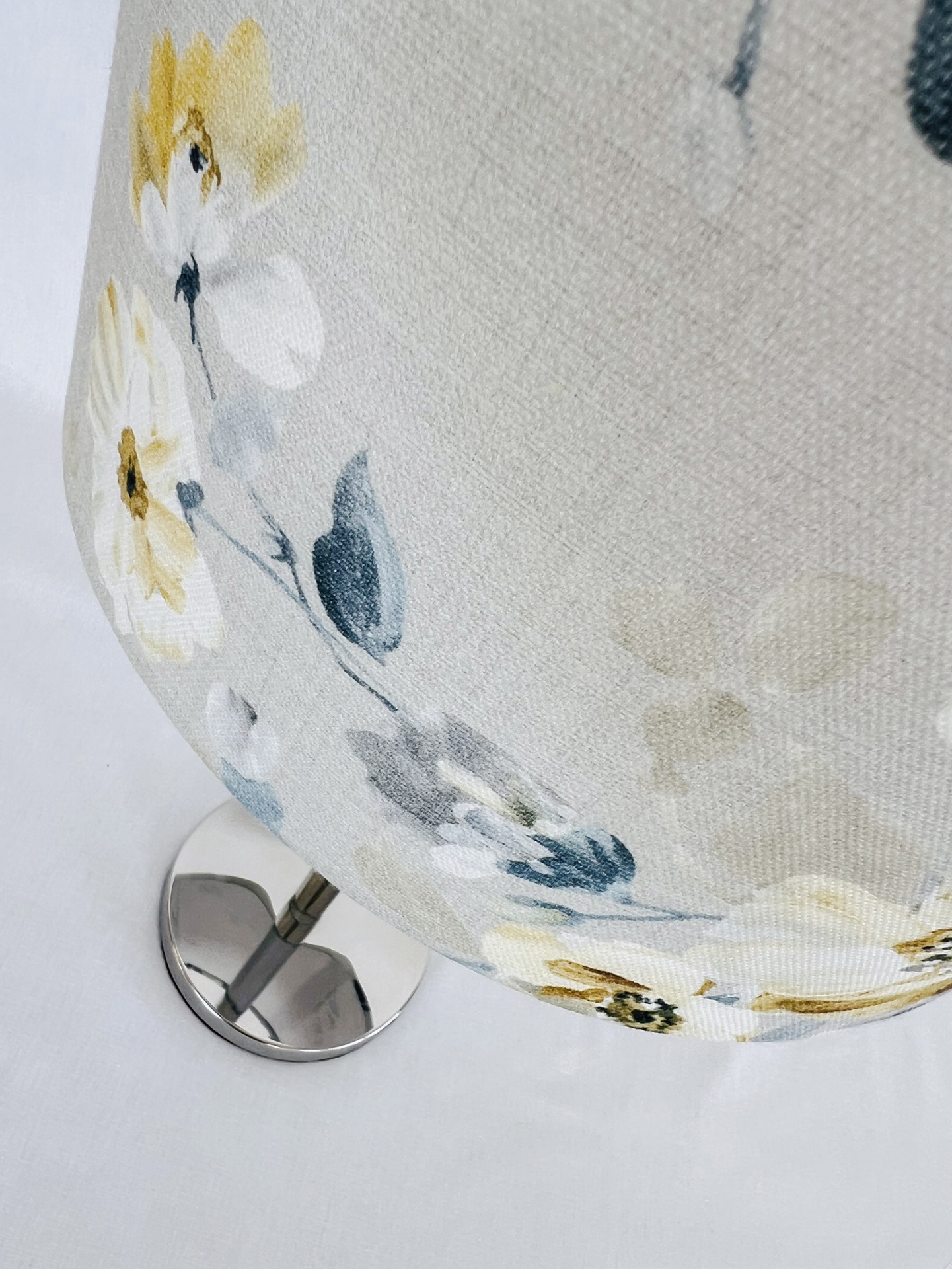 Candeeiro em inox com abat-Jour redondo 25 cm largura e 18cm de altura em tecido Adela, fabricado em Portugal.